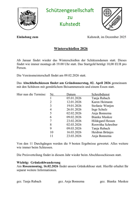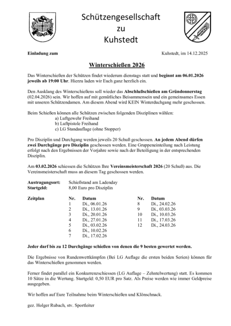 Bei den Damen der Gruppe A gewann Tanja Rubach das Winterschiessen nach 10 Durchgängen mit jeweils 20 Wertungsschüssen. In der Gruppe B siegte Königin Steff Wintjen. Meisterin der Winterserie wurde Tanja Rubach. Die Glücksscheibe wurde konsequent von Daniela Baron abgeräumt. Bei den Herren siegte souverän Holger Rubach in der Winterserie Gruppe A. Walter Schulz sicherte sich in der Gruppe B den ersten Platz. Vereinsmeister wurde Jörn Prigge mit 208,2 Ringen. Die Glücksscheibe des Abends gewann Meik Stelljes mit großem Abstand.